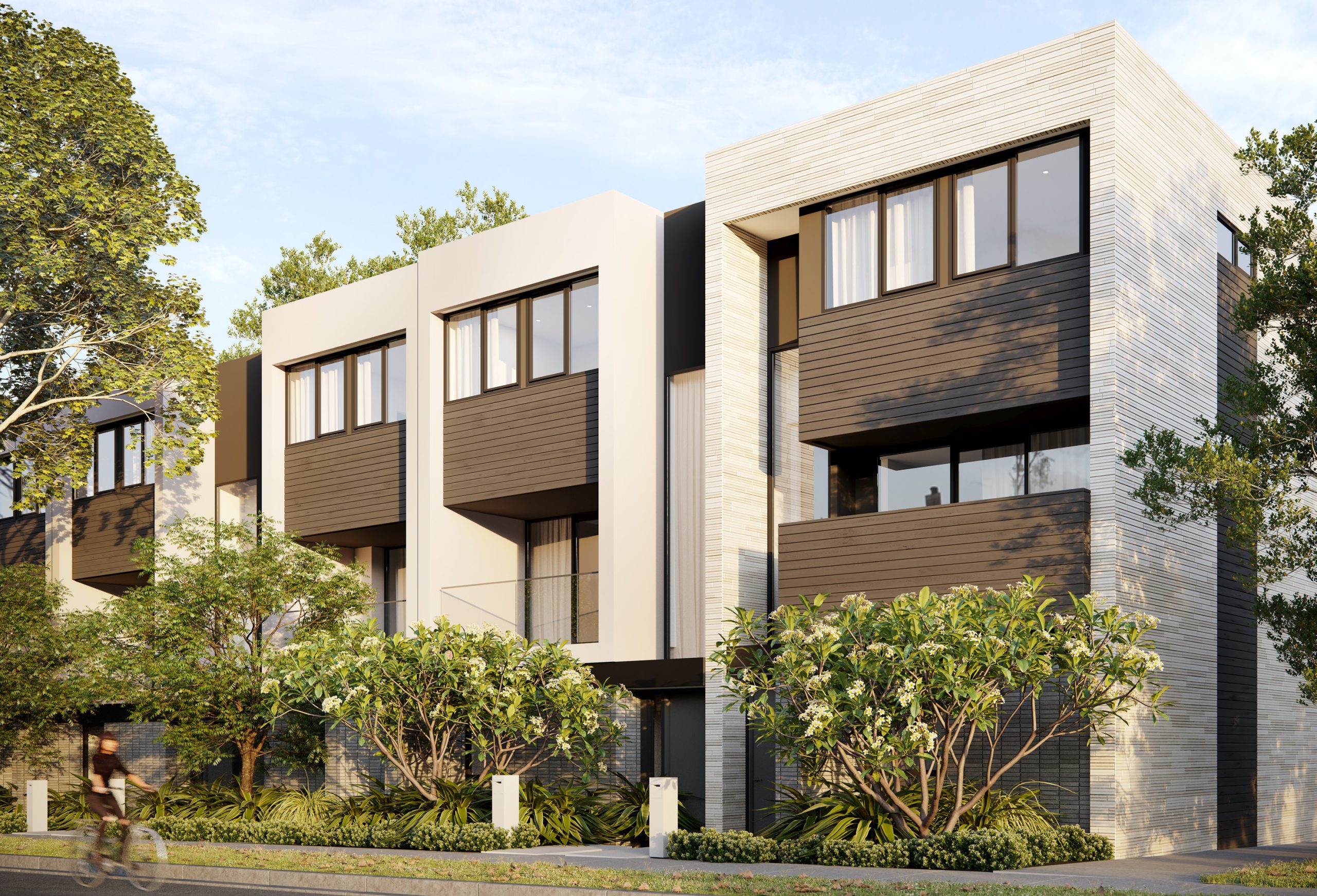 Externally, the townhomes are linear and robust, defined by clean lines and an articulation of solids and voids. Raw, tactilely rich materials in warm hues have been featured, creating an organic and undeniably authentic quality. Evoking a sense of individuality, the facades differ slightly throughout the development, allowing residents to feel like their home is uniquely and especially their own. Generous landscaping pays homage to the flora and fauna of Alphington while framing the homes in a lush, leafy sanctuary.